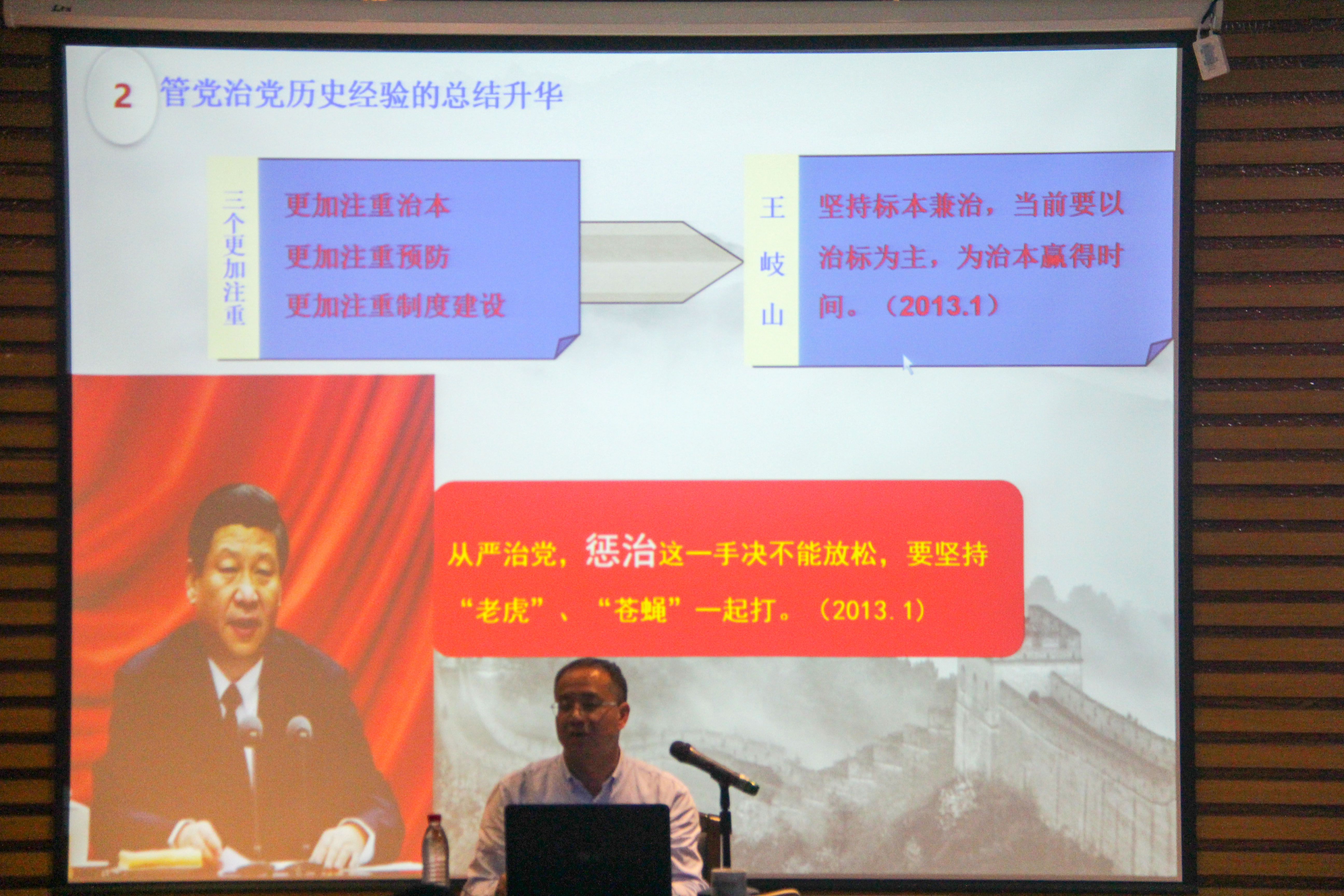 首先,何书记介绍了全面从严治党政策的时代背景与实行意义。他提到,从严治党“是巩固党长期领导地位的需要”、“是管党治党的总结升华”、“是解决党内矛盾的必然选择”这三个方面逐层展开,描述了党从建立以来所经历的去组织化及再组织化进程,也提醒同学们要避免出现“精神懈怠、能力不足、脱离群众、消极腐败”这四大危险情况。紧接着,何书记以党中央“八项规定”为例,强调了中国共产党坚定不移全面从严治党的深远意义,并重点讲述了党在政治、思想以及经济、作风上的建设和全面领导的情况。最后,何书记向同学们讲述了中国共产党在全面实行从严治党以来所取得的显著成效,并对同学们提出了希望,希望大家将来能够勇于承担党给予的重大考验和自己所要承担的责任,以顽强的意志、高尚的品质来正风肃纪、反腐惩恶。