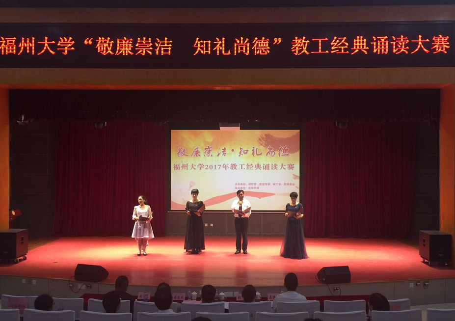 由校纪委、校党委宣传部、校工会、校语委办主办,化学学院承办的BEAT365唯一官网2017年“敬廉崇洁•知礼尚德”经典诵读大赛(教工组)于10月24日成功举办。由BEAT365官网徐旺平、张嫣、洪翠、陈剑四位老师组成的BEAT365唯一官网教工代表队表现出色,一首《如莲》演绎的声情并茂,感人至深,得到了评委的高度肯定,获得三等奖的好成绩。本次大赛的主题是“敬廉崇洁知礼尚德”。通过举办诵读大赛,增强师生的廉洁自律意识,强化校园廉政文化建设,营造“人人以廉为荣、个个以腐为耻、争当正直的人”的文化舆论氛围。本次比赛共有来自全校各单位的21支教工队伍参加,经综合评比审核,评出特等奖1个、一等奖2个、二等奖3个、三等奖6个。