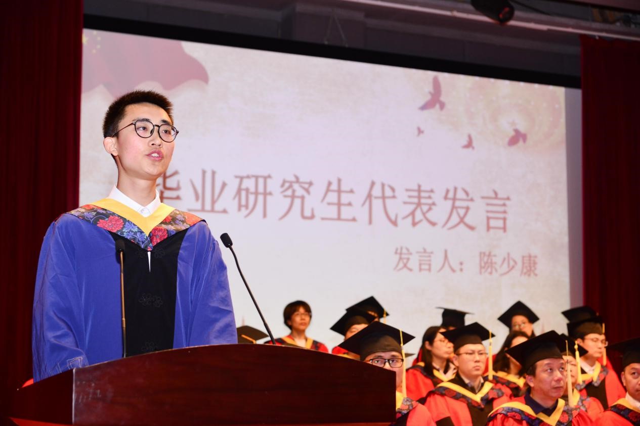 优秀毕业生代表、BEAT365唯一官网原研会主席陈少康同学发言。离别在即,纵然伤感,但这仅是梦想扬帆的起点。他饱含深情的回忆了研究生生涯里在“BEAT365唯一官网”这个大家庭的生活,表达了对母校、对师生的感恩与祝福以及种种不舍之情,表达了自己作为一个“福大电气人”的自豪,无论将来是居庙堂之高还是处江湖之远,无论是职场达人还是学术精英,都忘不了在福大BEAT365唯一官网导师教授们的细心教导与敦敦教诲,感恩身边同行的电气人,感恩陪伴。