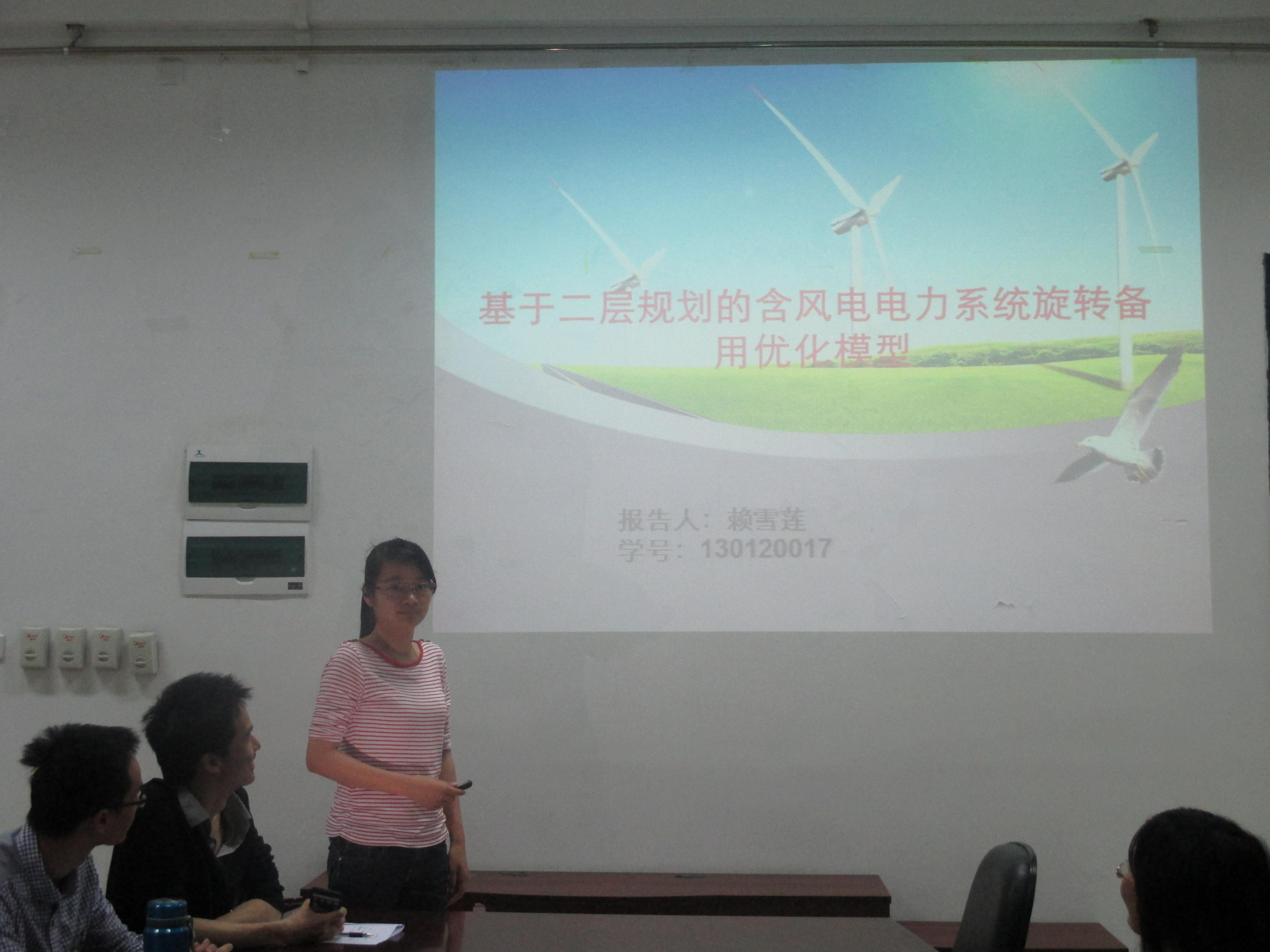 在主持人的简单开场之后,报告会就开始了。首先进行报告的是林仁杰同学的《基于相平面和遗传BP神经网络的配网线路绝缘预警研究》,林仁杰同学的报告详细讲述了将相平面和遗传BP神经网络法应用于配网线路绝缘预警的想法和仿真实验。接下来黄云程同学就《应用去极化能量谱评估变压器老化受潮状态》进行了报告。紧接着吴荣福同学对《福建电网降温负荷研究分析》进行阐述,吴荣福同学首先对他在公司实习的实际情况做了简短介绍,由此引出了他的研究课题——福建电网降温负荷研究,本研究主要是通过算法来预测电网的降温负荷以此来为电网的调配提供依据。之后张宇航同学报告了《基于广义神经网络与模糊聚类的变压器故障诊断》,张宇航同学主要阐述了变压器故障的诊断。再接着赖雪莲同学对《基于二层规划的含风电电力系统旋转备用优化模型》进行了陈述。最后由林小雨同学报告了《考虑风电出力偏差和调度经济性的风电接纳水平优化》。