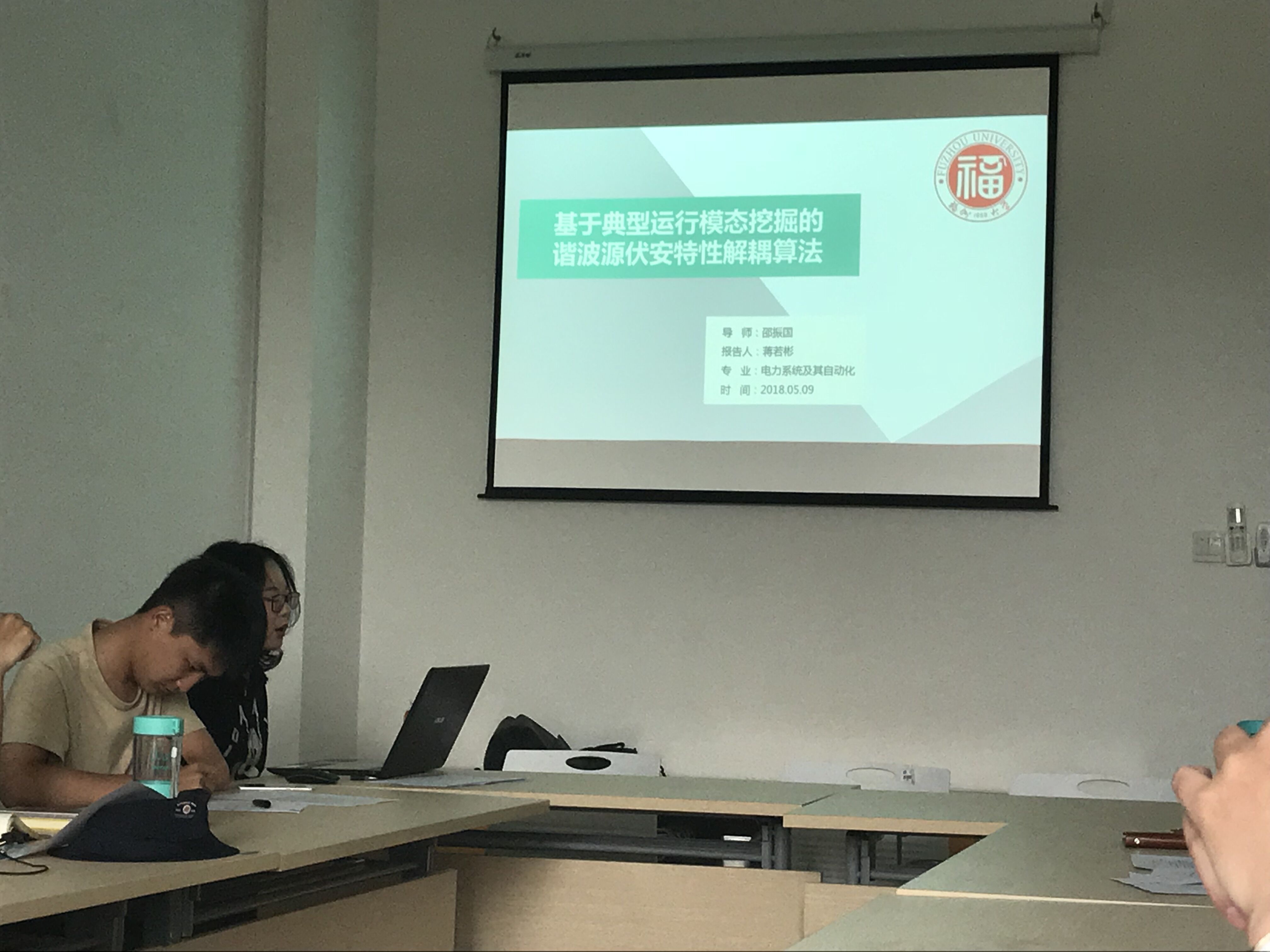 主持人简单开场过后,报告会就开始了。本次报告会的顺序依次是周旺同学的《用于平抑风电并网波动的混合储能控制策略研究》、周琪琪同学的《风电谐波发射水平的不确定性评估》、蒋若彬同学的《基于典型运行模态挖掘的谐波源伏安特性解耦算法》、吴宇杭同学的《基于深度学习算法的风电输出功率预测研究》、王煜杰同学的《基于并网点风电价值的风电接纳水平研究》、刘炳南同学的《基于深度学习的配电网高阻接地故障识别方法研究》、黄孚远同学的《考虑海上风电接入的电网侧无功补偿策略》、郭丽云同学的《基于价值分析的微电网风电接纳水平研究》,以及陈富裕同学的《单绕组无轴承磁通切换电机驱动控制研究》。
